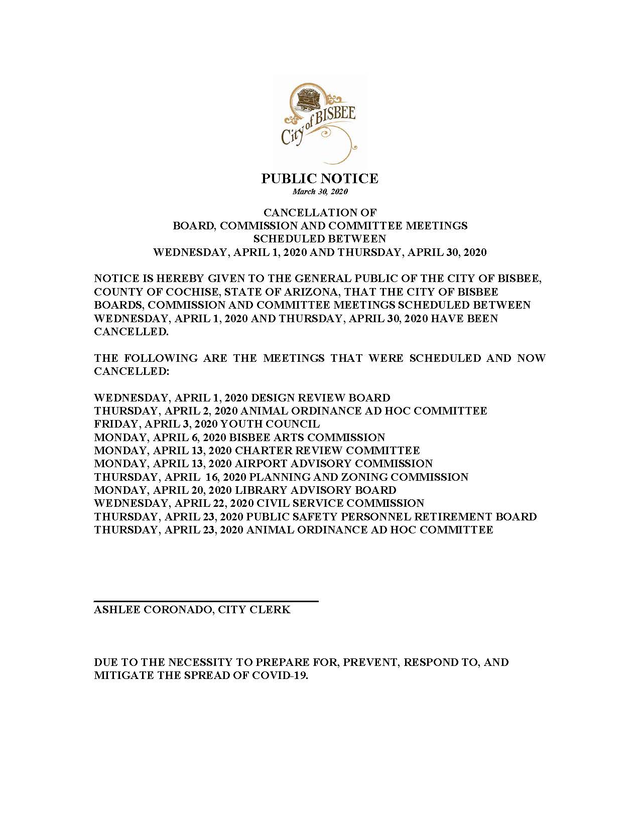 Public Notice- Cancellation of the Bisbee Arts Commission Meeting Scheduled for April 6, 2020
